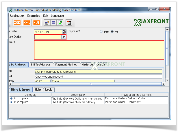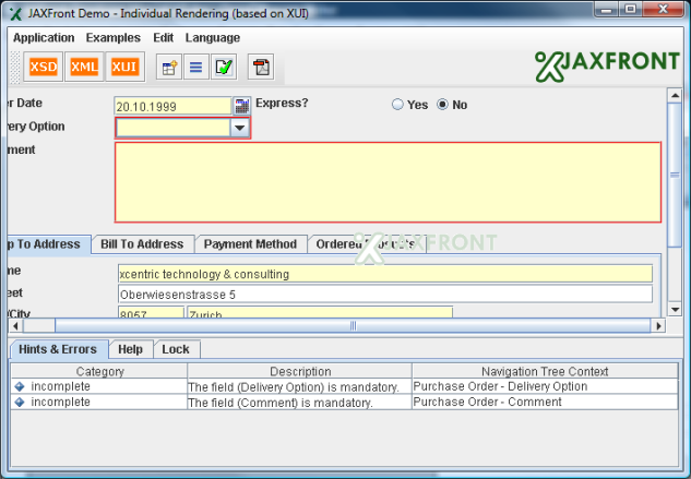 - Validate Validates the current dom against the xsd and xui rules and shows the validation errors in a table.
