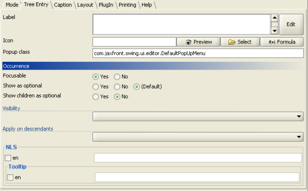 The Tree Entry tab enables you to define whether a component appears in the navigation tree. By default, only the root element and complex lists are inserted into the tree. However, each component can be entered into the tree.