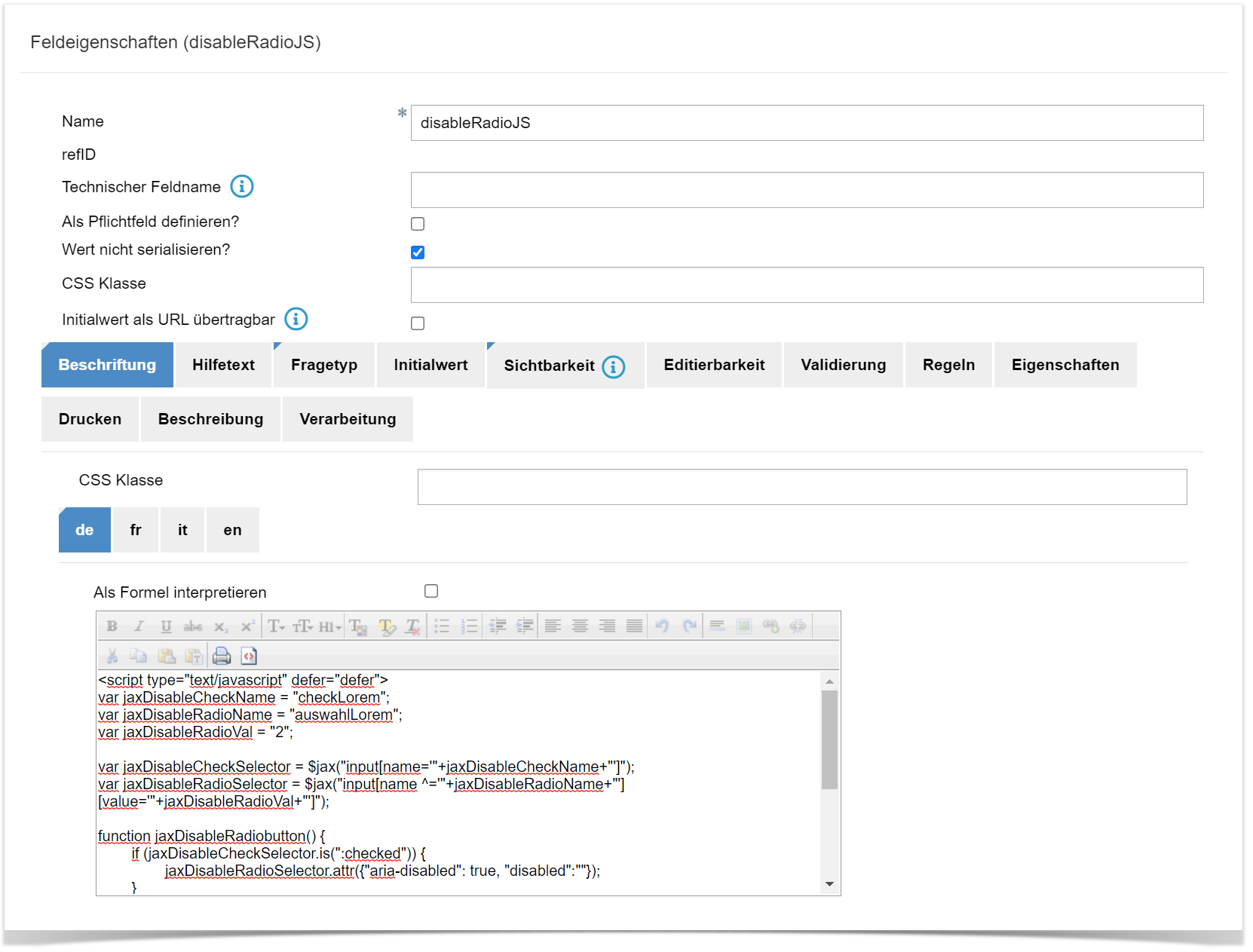 | var jaxDisableFromRadioName = "xxx"; | Name der Radiobutton-Auswahl (Auslöser) | triggerLorem |