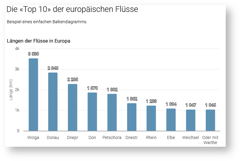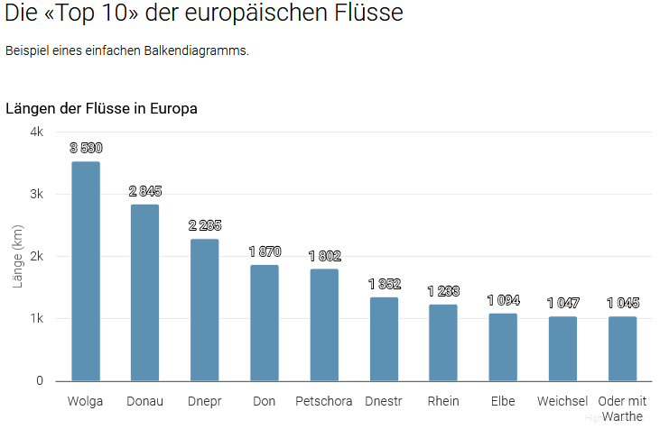 Ausgabe als Säulen-Diagramm - maximale Ausgabe auf Flüsse, welche länger als 1040 km sind, damit nur die Top10 im Diagramm angezeigt werden.