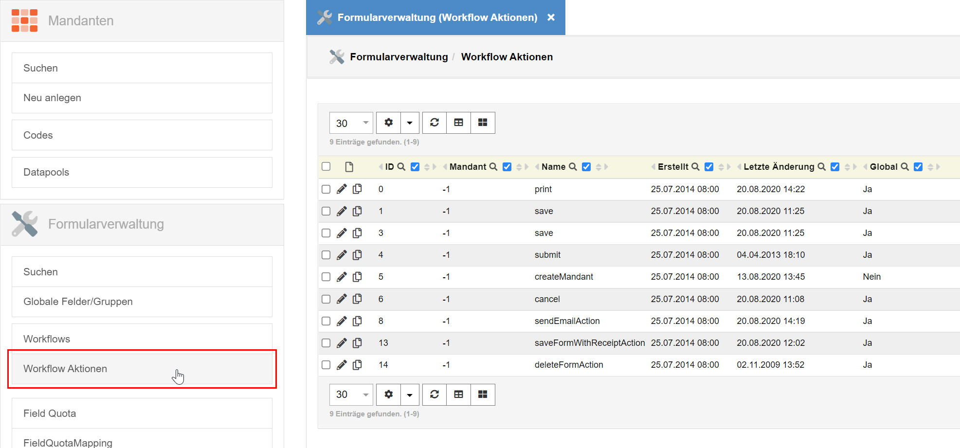 2. Mandantenweite Aktionen: Aktionen, die von einem Administrator definiert wurden, können nur innerhalb der Formulare des jeweiligen Mandanten verwendet werden.