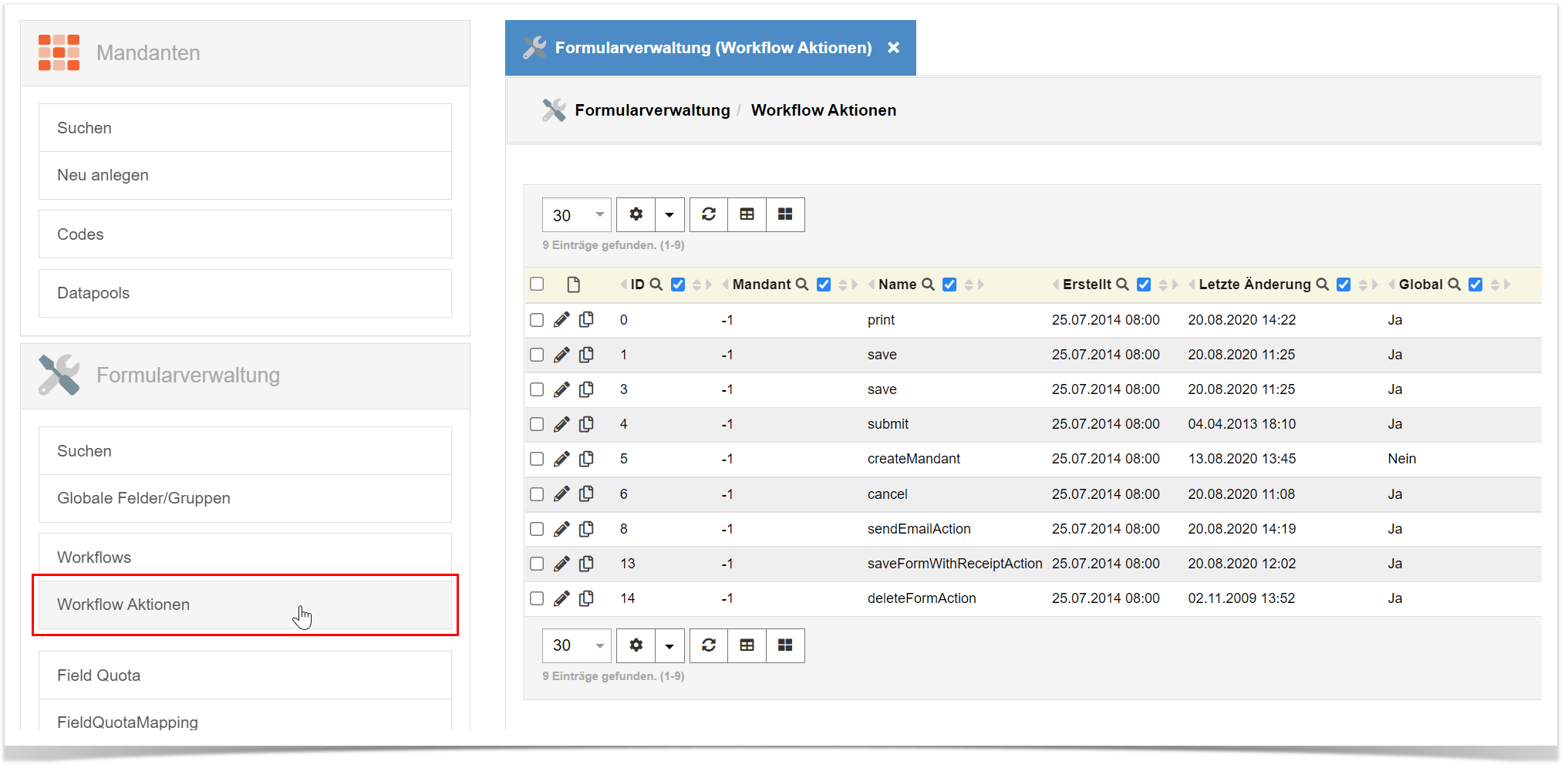 - Mandantenweite Aktionen: Aktionen, die von einem Administrator definiert wurden, können nur innerhalb der Formulare des jeweiligen Mandanten verwendet werden.