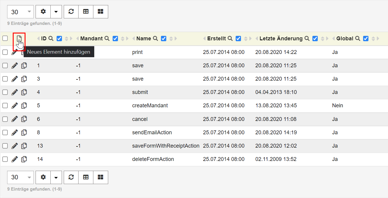1. Systemweite Aktionen: Aktionen, die von einem System Benutzer definiert wurden, können von allen Mandanten verwendet werden. Diese Aktionen können nur vom Systemadministrator gepflegt werden.