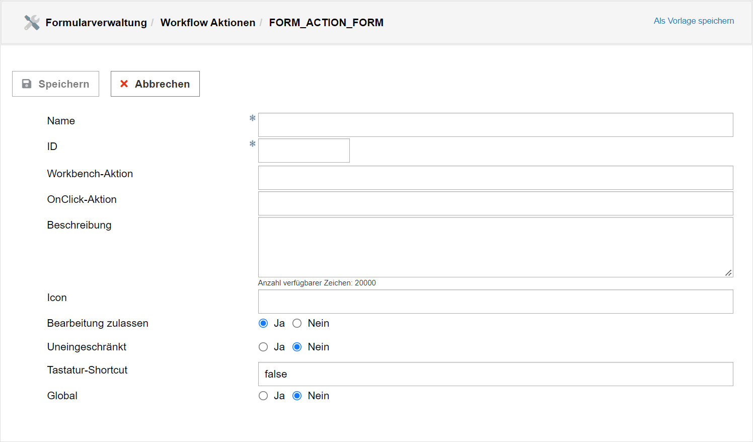 • Aktionen werden als HTML-Buttons am oberen Rand des Formulars dargestellt. Als HTML Vorlage dient die in der Datenbank gespeicherte Datei „FormActionControl.html".