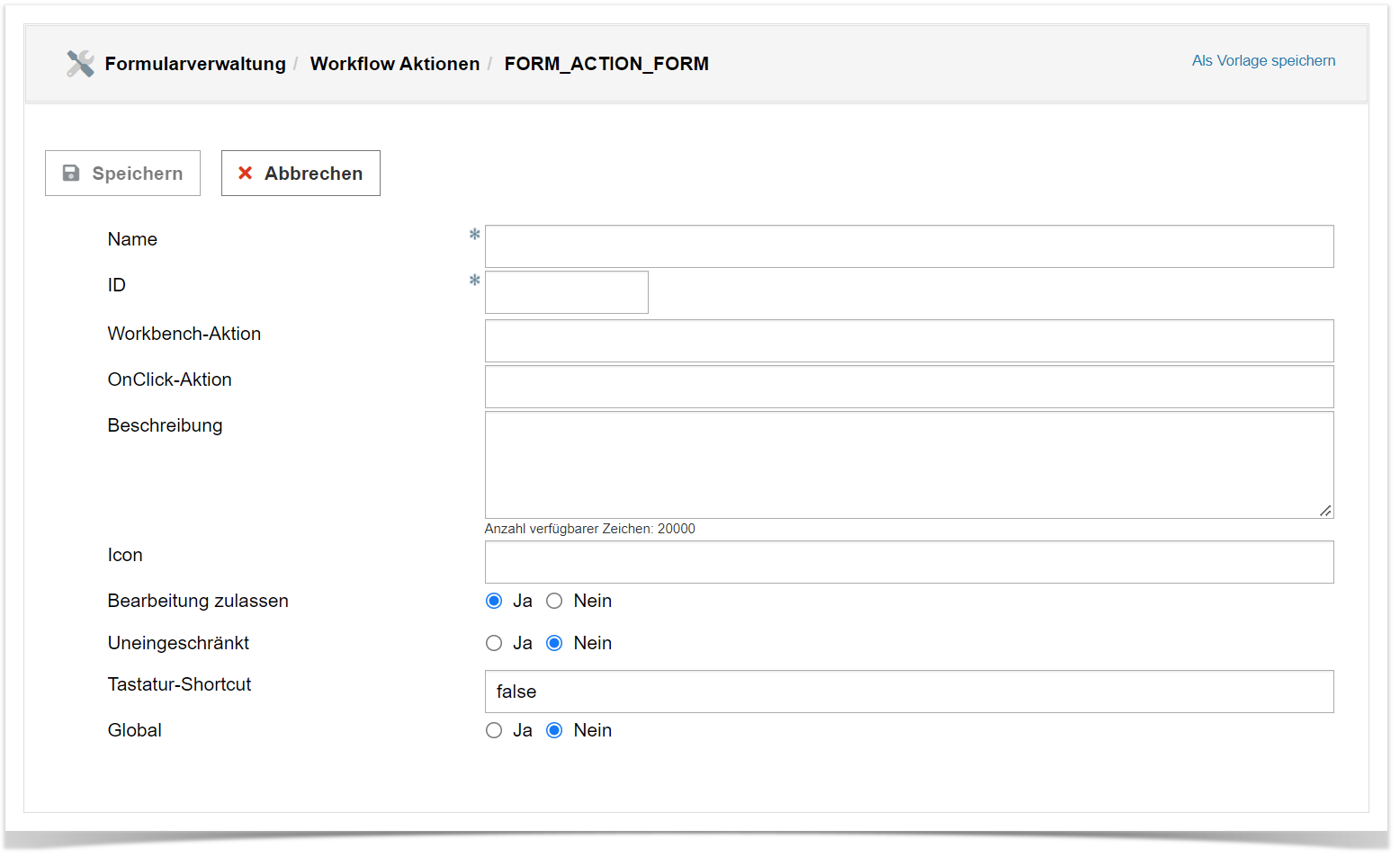 - Aktionen werden als HTML-Buttons am oberen Rand des Formulars dargestellt. Als HTML Vorlage dient die in der Datenbank gespeicherte Datei „FormActionControl.html".