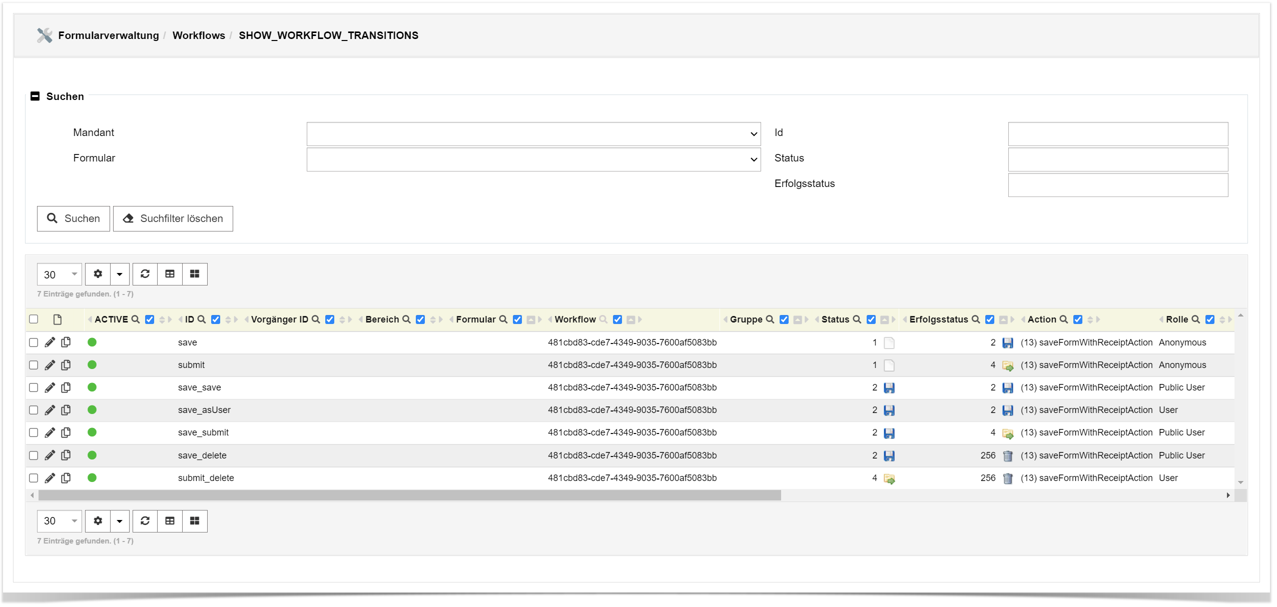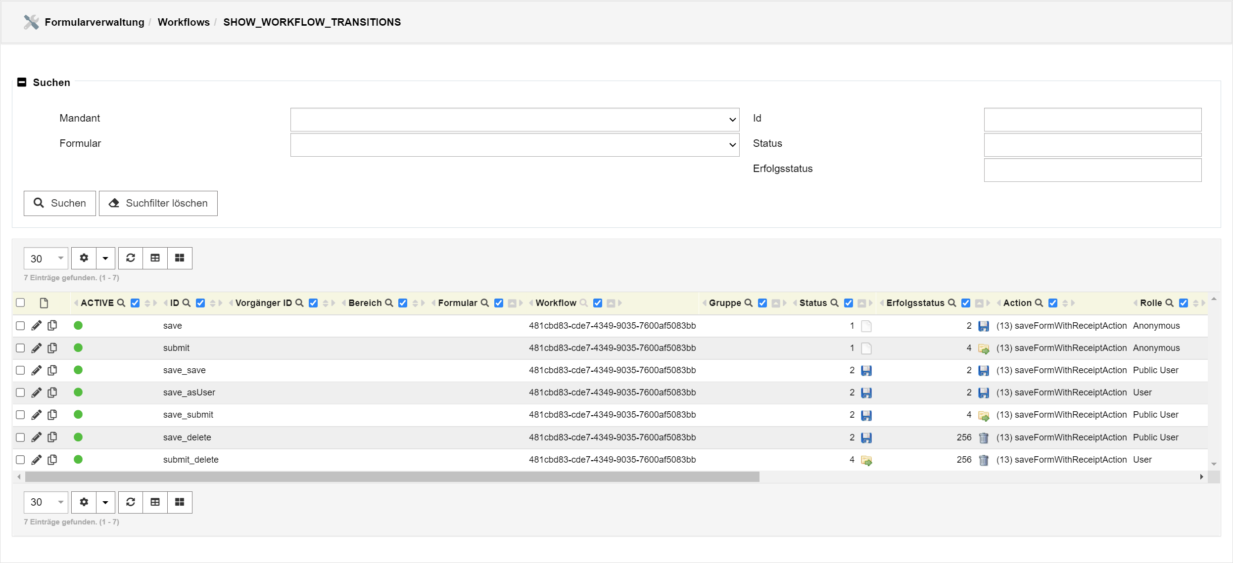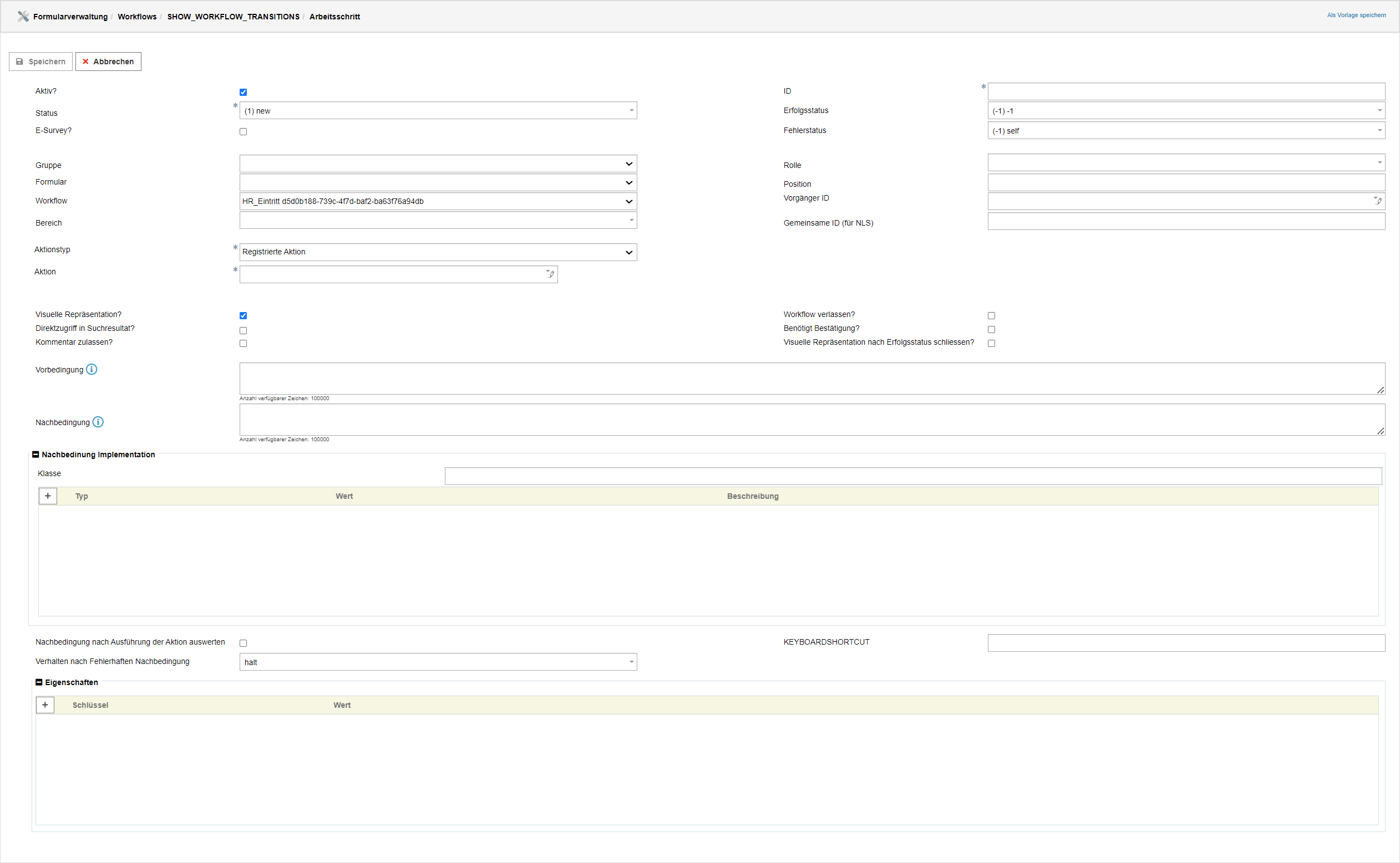 Die Workflow-Übergänge definieren die Weitergabe des Formular-Prozesses von einem Status zu einem anderen. Der eigentliche Arbeitsfluss wird mittels Workflow-Kanten (Transitions) determiniert, in dem man eine Aktion zwischen zwei Status festlegt.