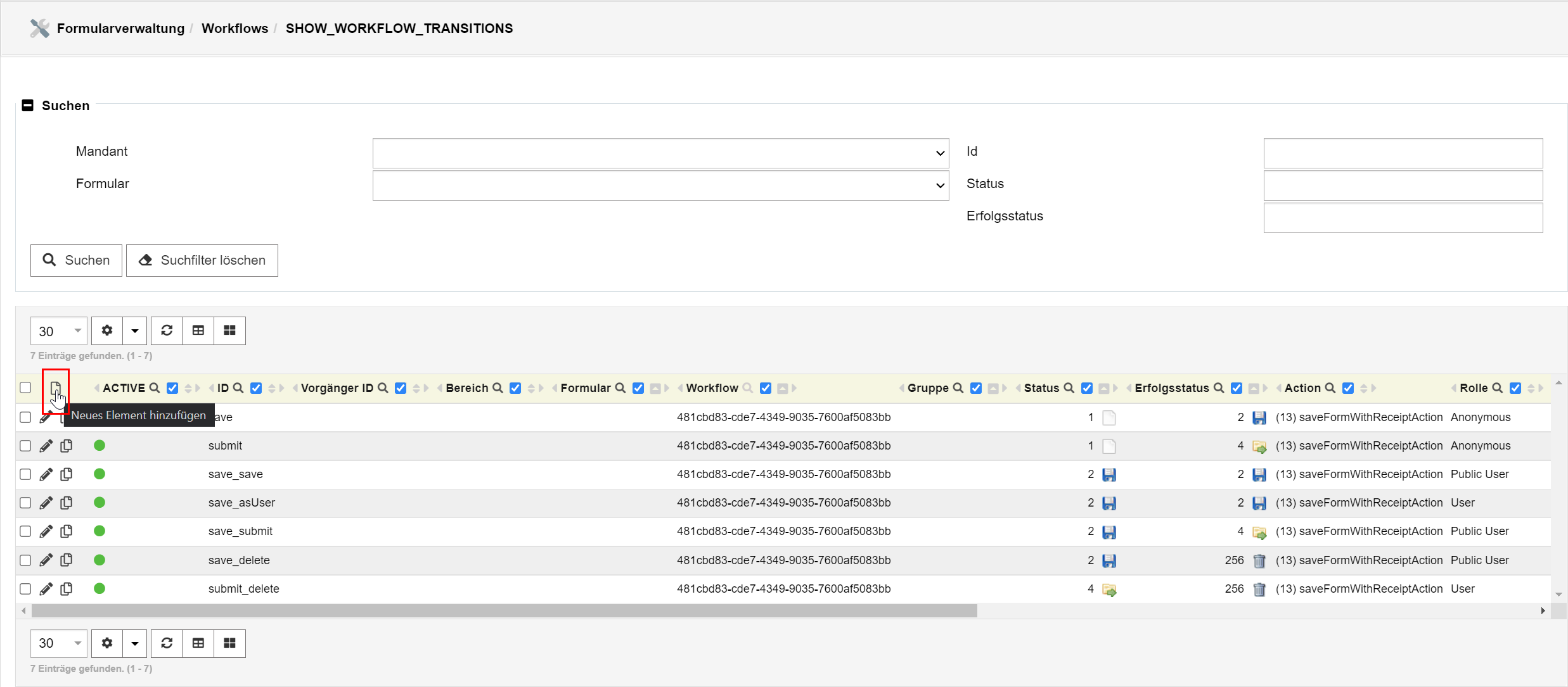 Ein neuer Übergang wird durch das Betätigen des Schaltelementes "Neues Element hinzufügen " innerhalb der Gruppe "SHOW_WORKFLOW_TRANSITIONS" eines Workflows erzeugt.