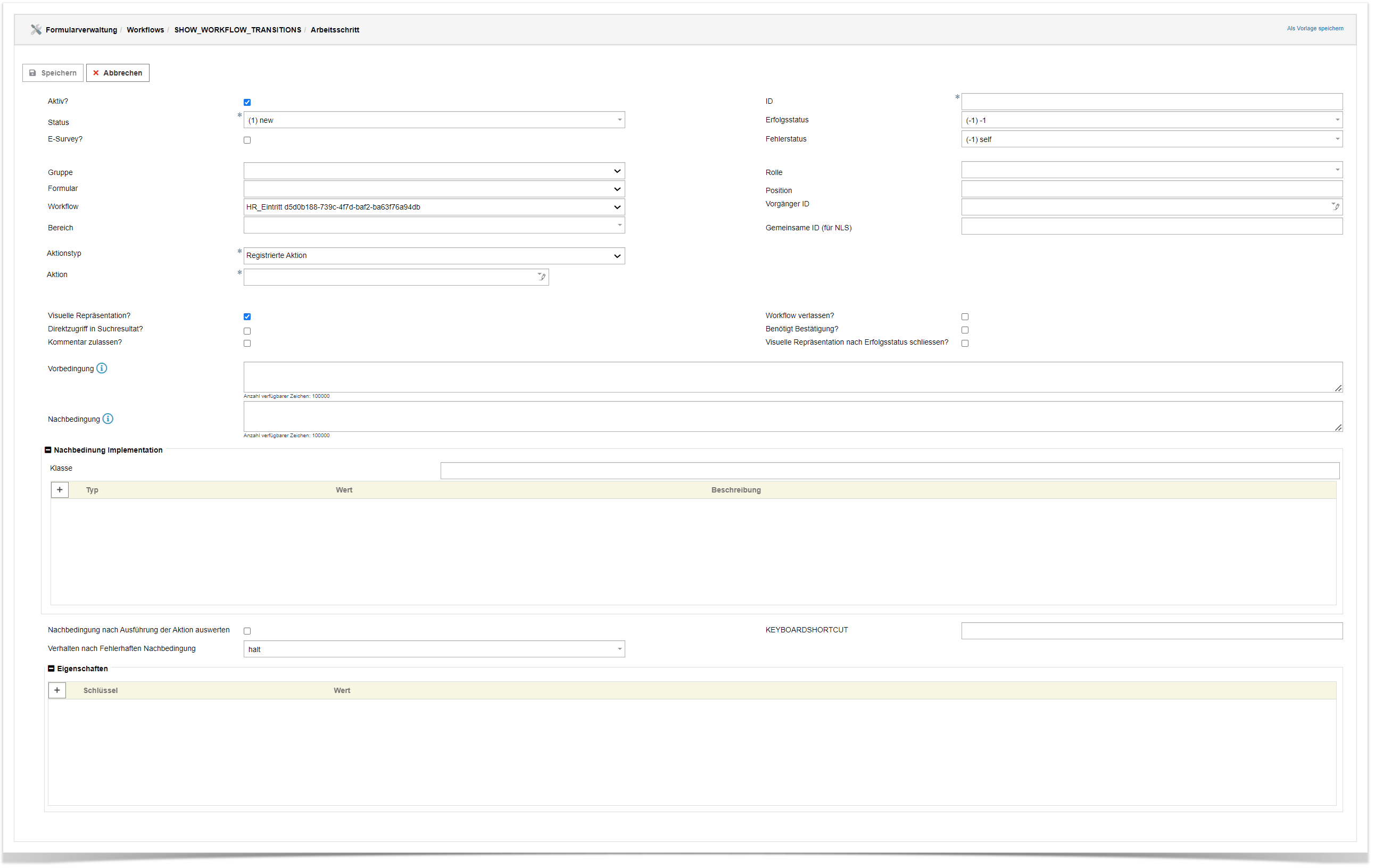 | Vorbedingung | Definiert eine Bedingung (als Formel), die erfüllt sein muss, damit der Arbeitsschritt aktiviert wird |