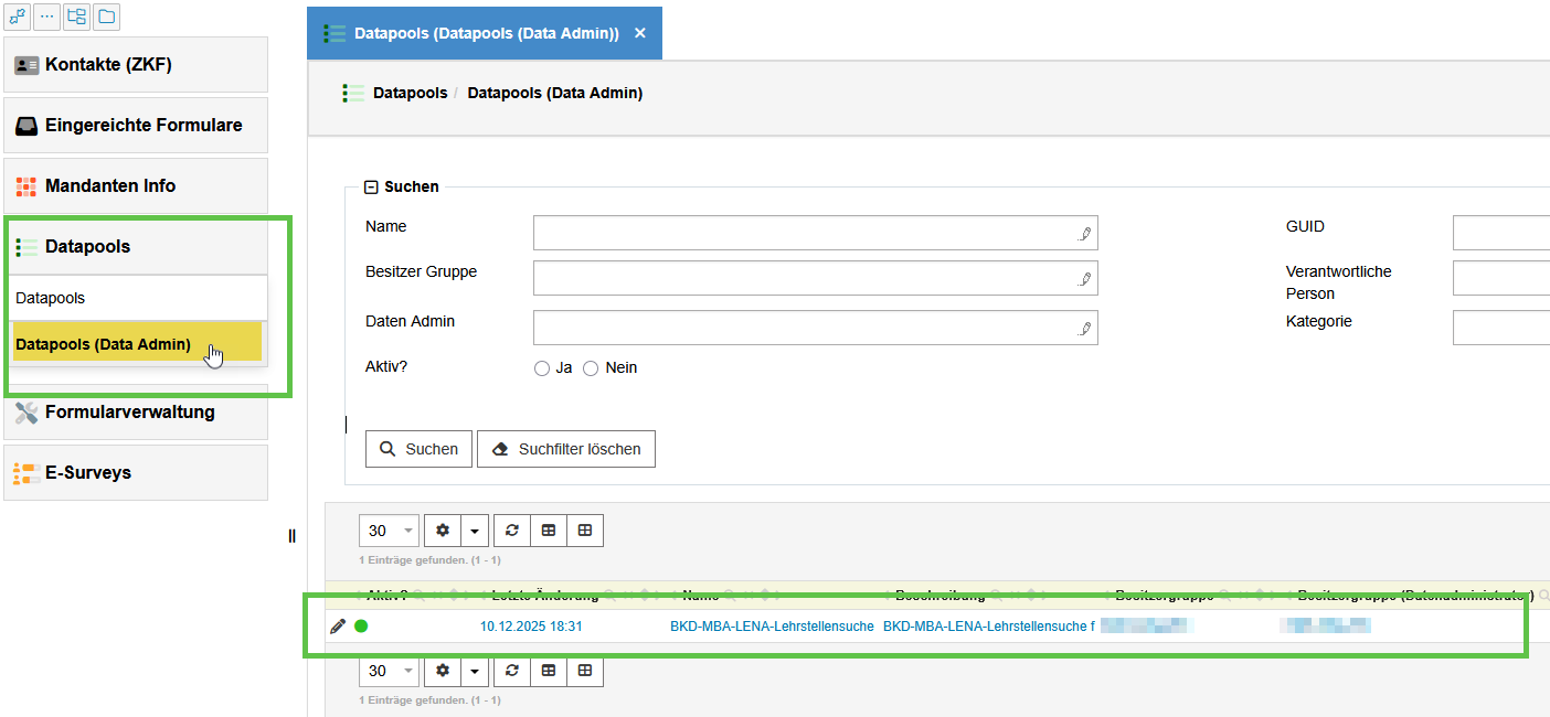Im Standarfall wird anhand der Berechtigung direkt der gewüsnchte Datenpool angezeigt.