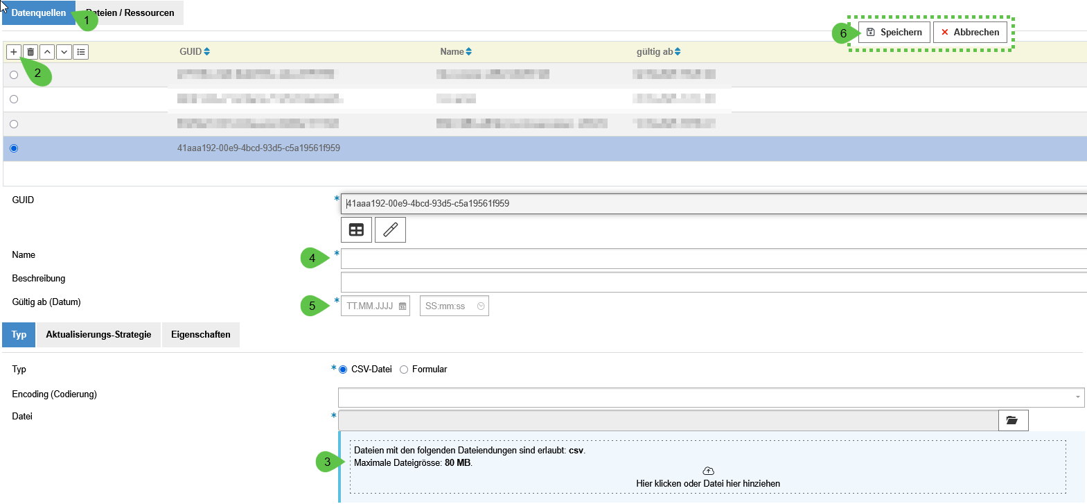 - Vorhandene Datenquellen. Das sind alle Uploads die gespeichert sind. Es werden aktive, vergangene oder zukünfigtig aktive Datenquellen aufgelistet.