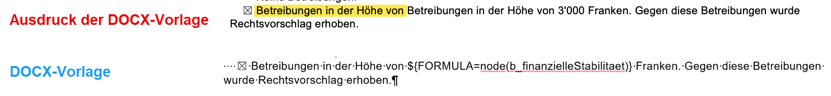 ...Die Kosten betragen CHF ${FORMULA=node(f_kostenDok)} pro Dokument... > Des führt zu dieser Ausgabe « ...Die Kosten betragen CHF 25.00 pro Dokument... »
