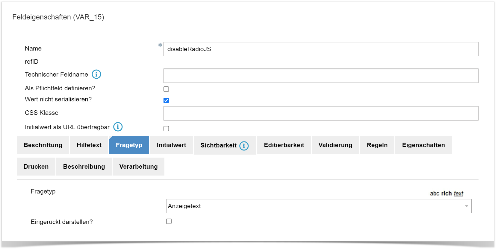 - Feld mit Fragetyp als Anzeigetext erstellen, Sichtbarkeit auf false stellen