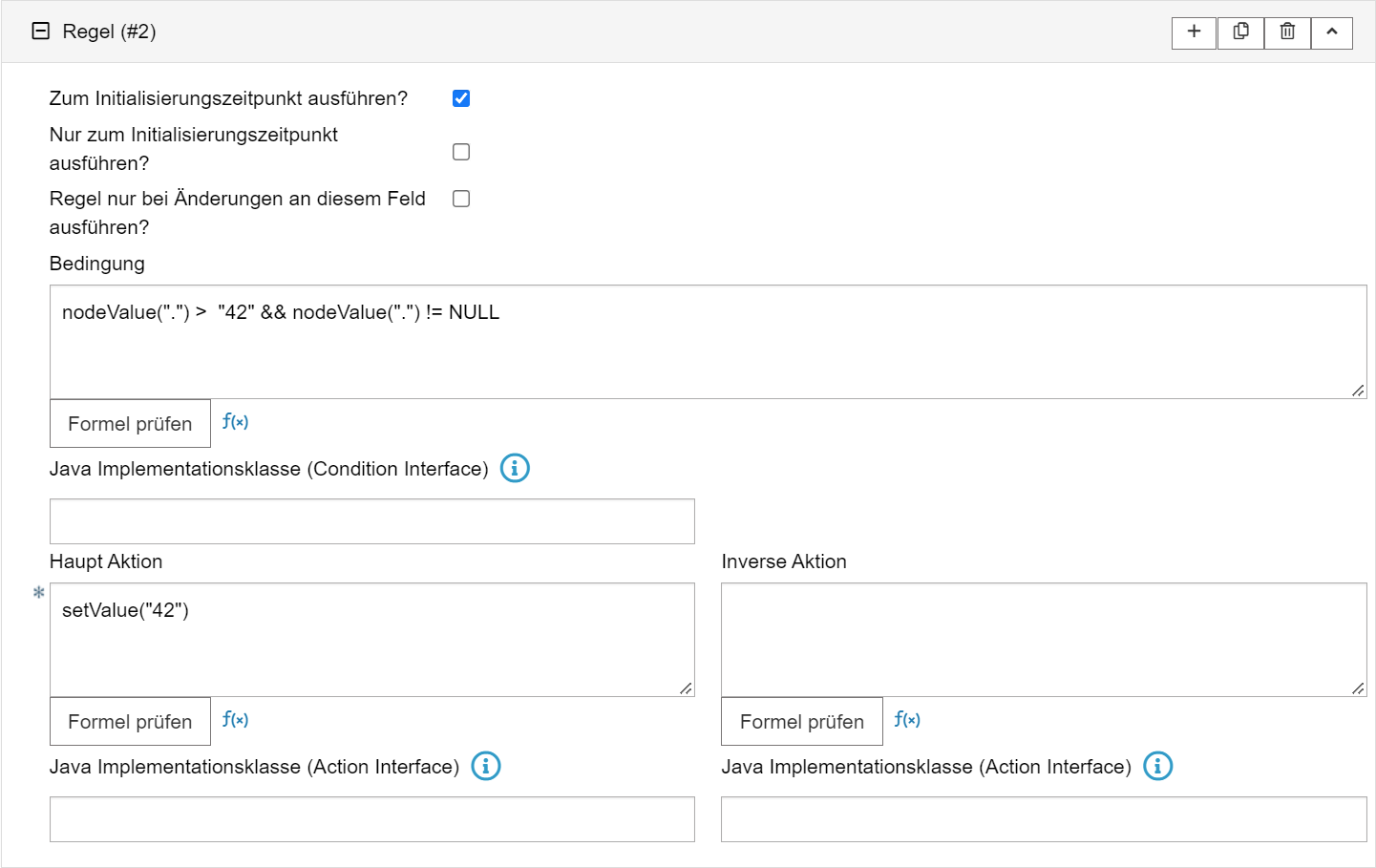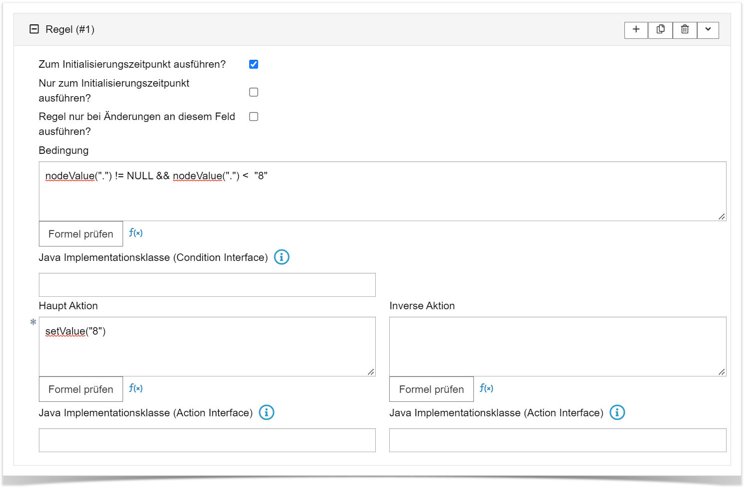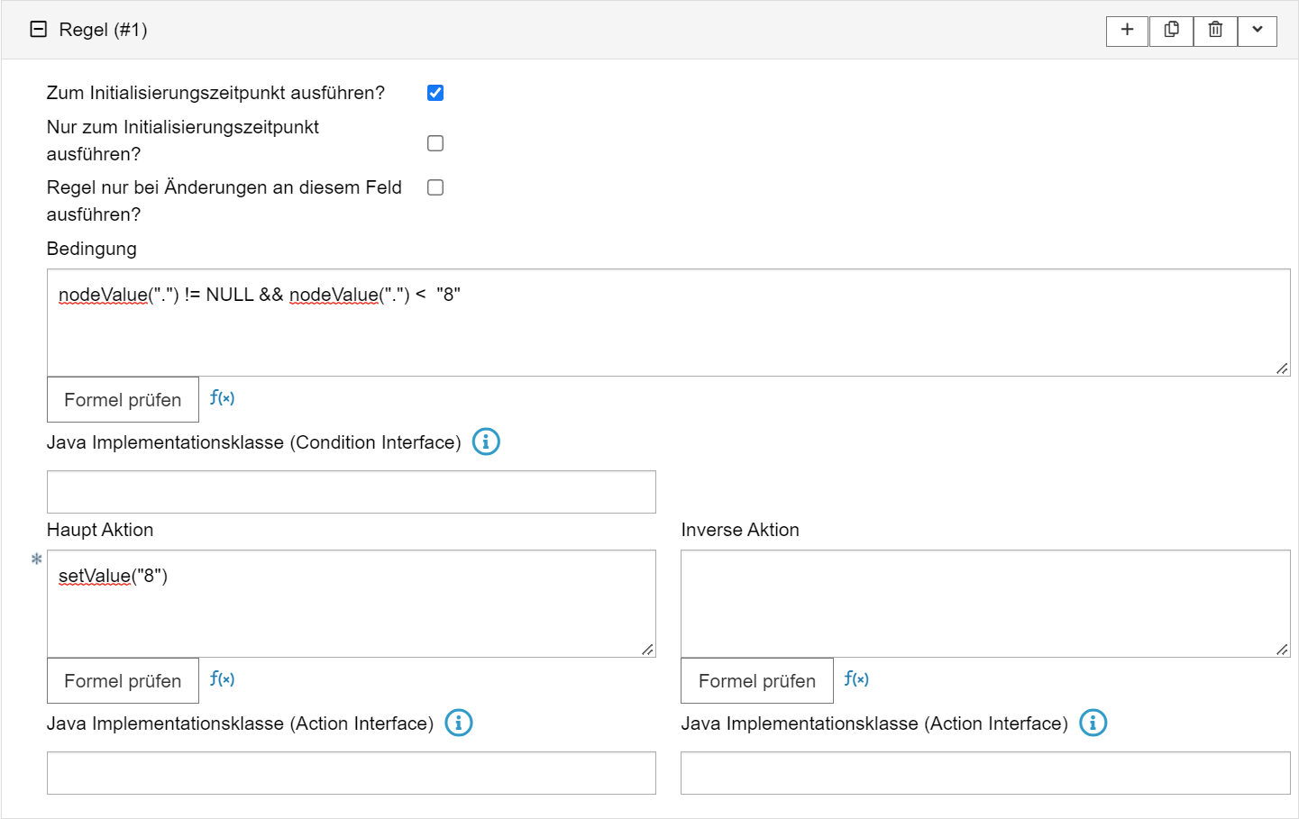Bedingung Hauptaktion Beschreibung nodeValue(".") != NULL && nodeValue(".") < "8" setValue("8") Wenn der Wert nicht gleich NULL und kleiner als 8 ist, schreibe 8 Regel #2 für den Maximalwert hinzufügen