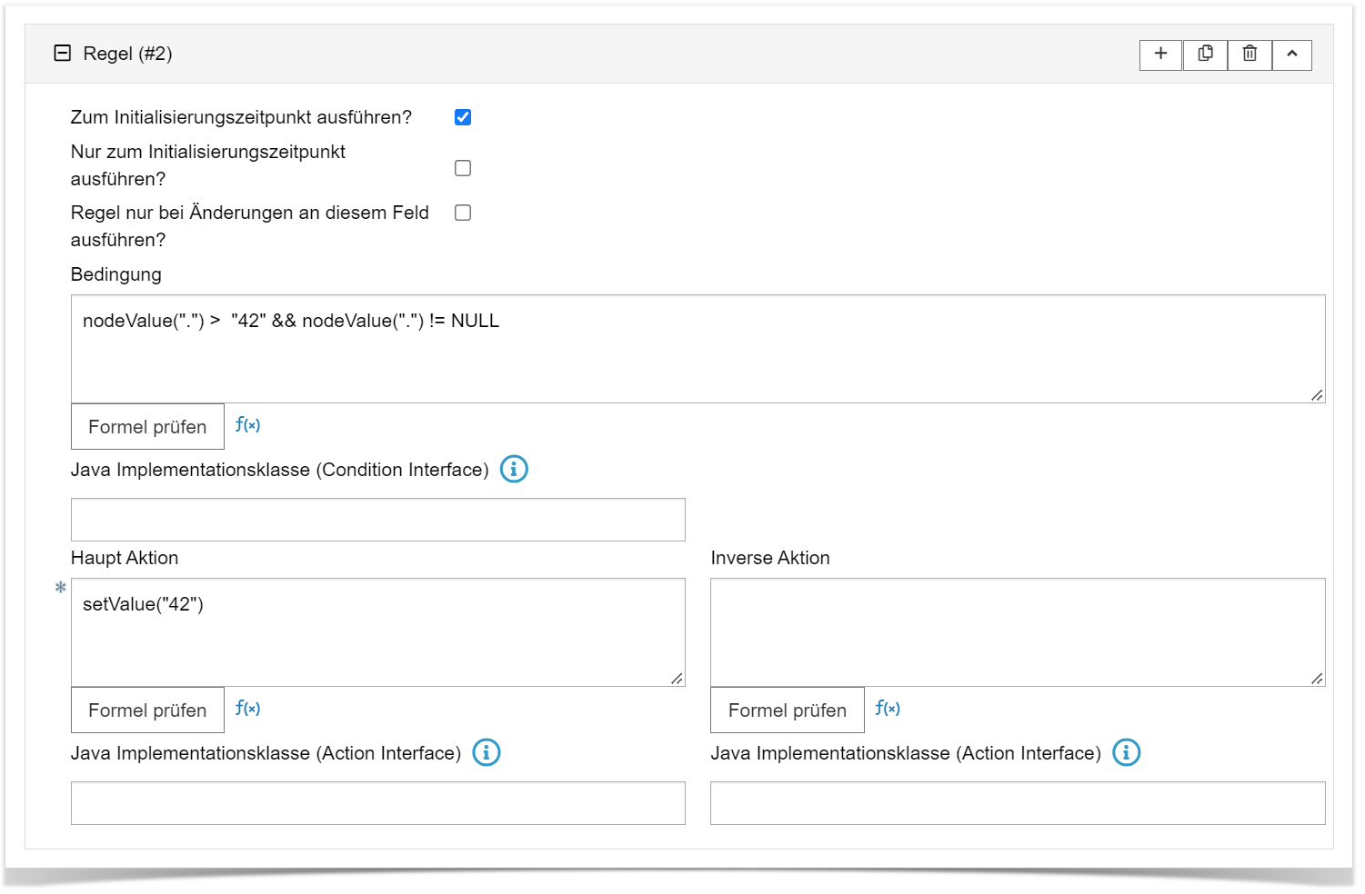 Bedingung Hauptaktion Beschreibung nodeValue(".") != NULL && nodeValue(".") > "42" setValue("42") Wenn der Wert nicht gleich NULL und grösser als 42 ist, schreibe 42