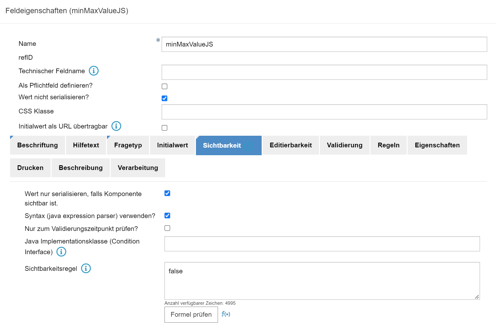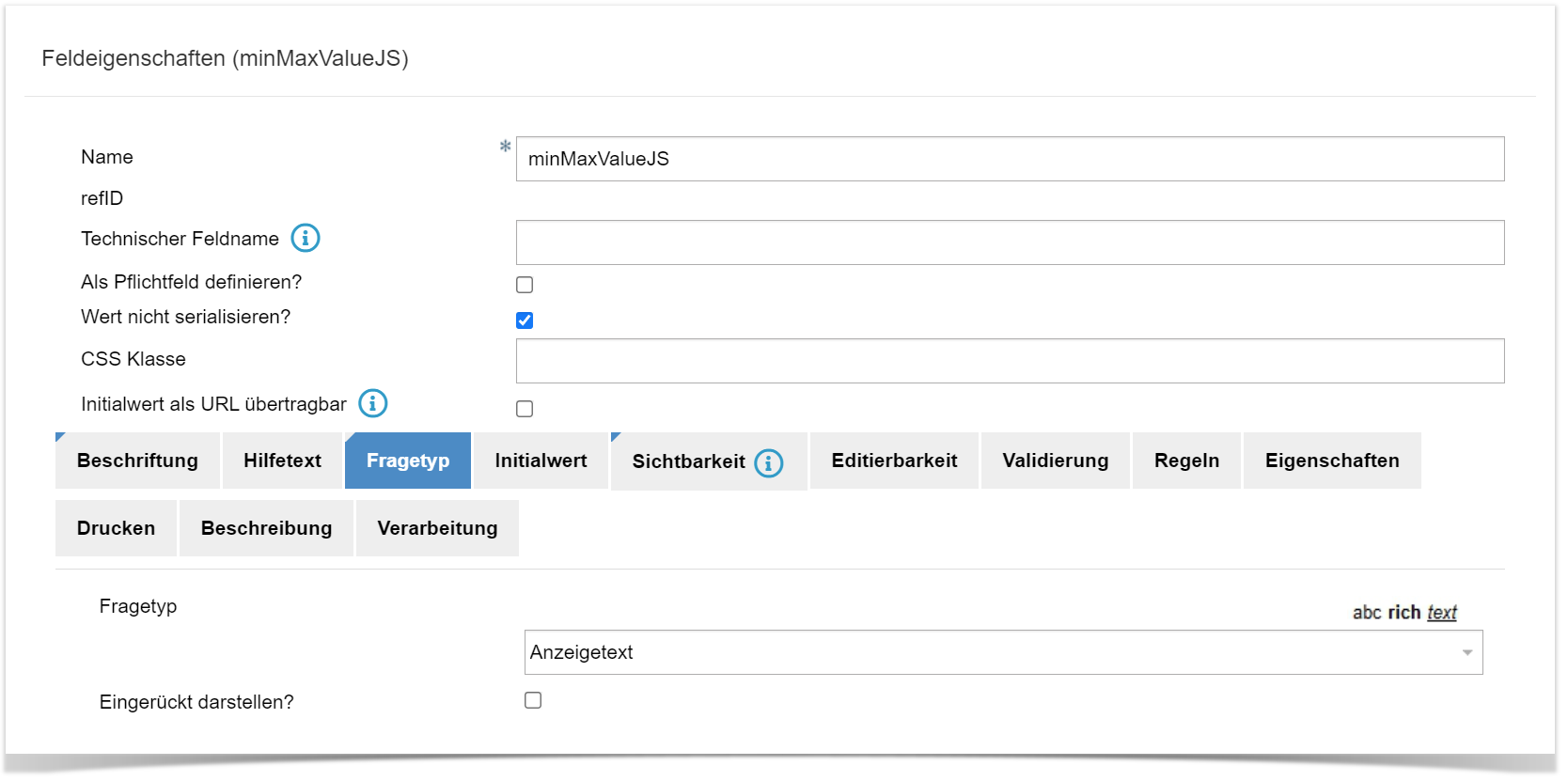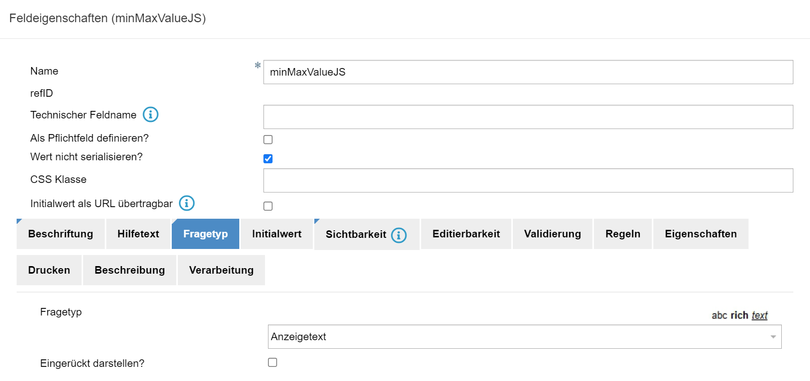 Feld mit Fragetyp als Anzeigetext erstellen, Sichtbarkeit auf false stellen