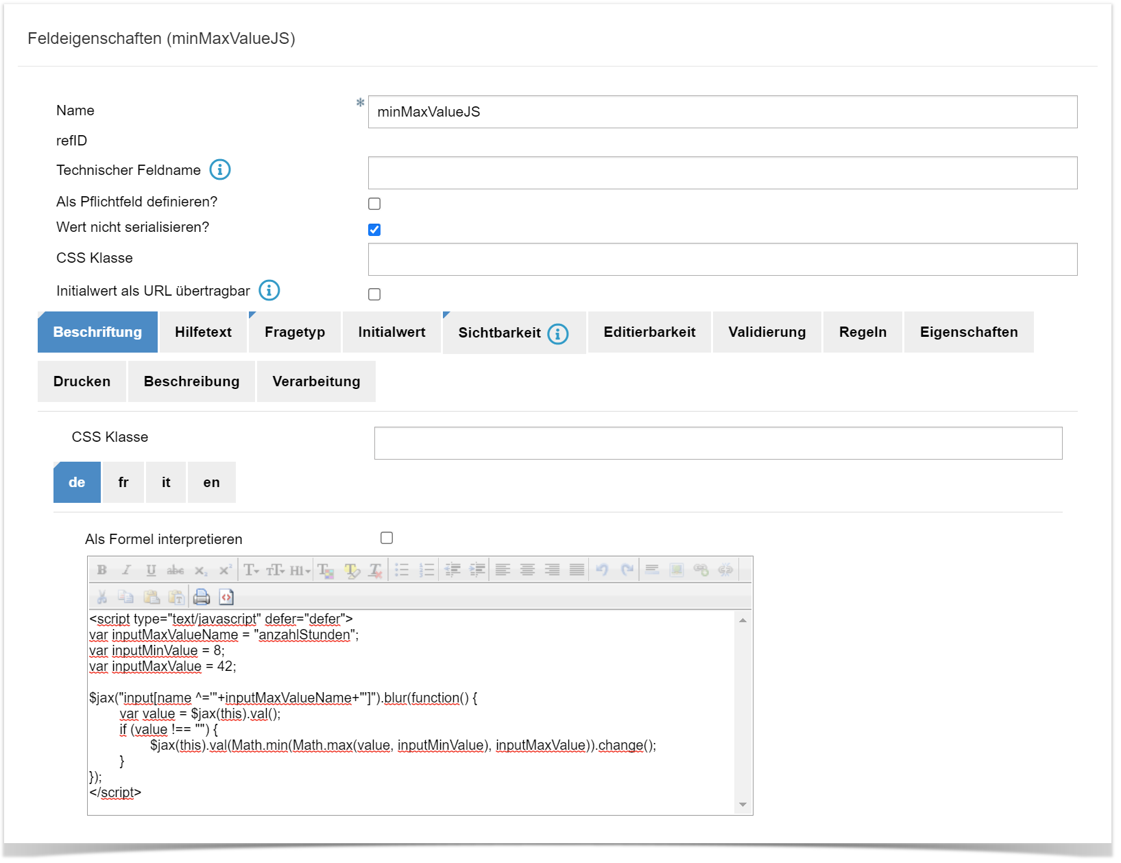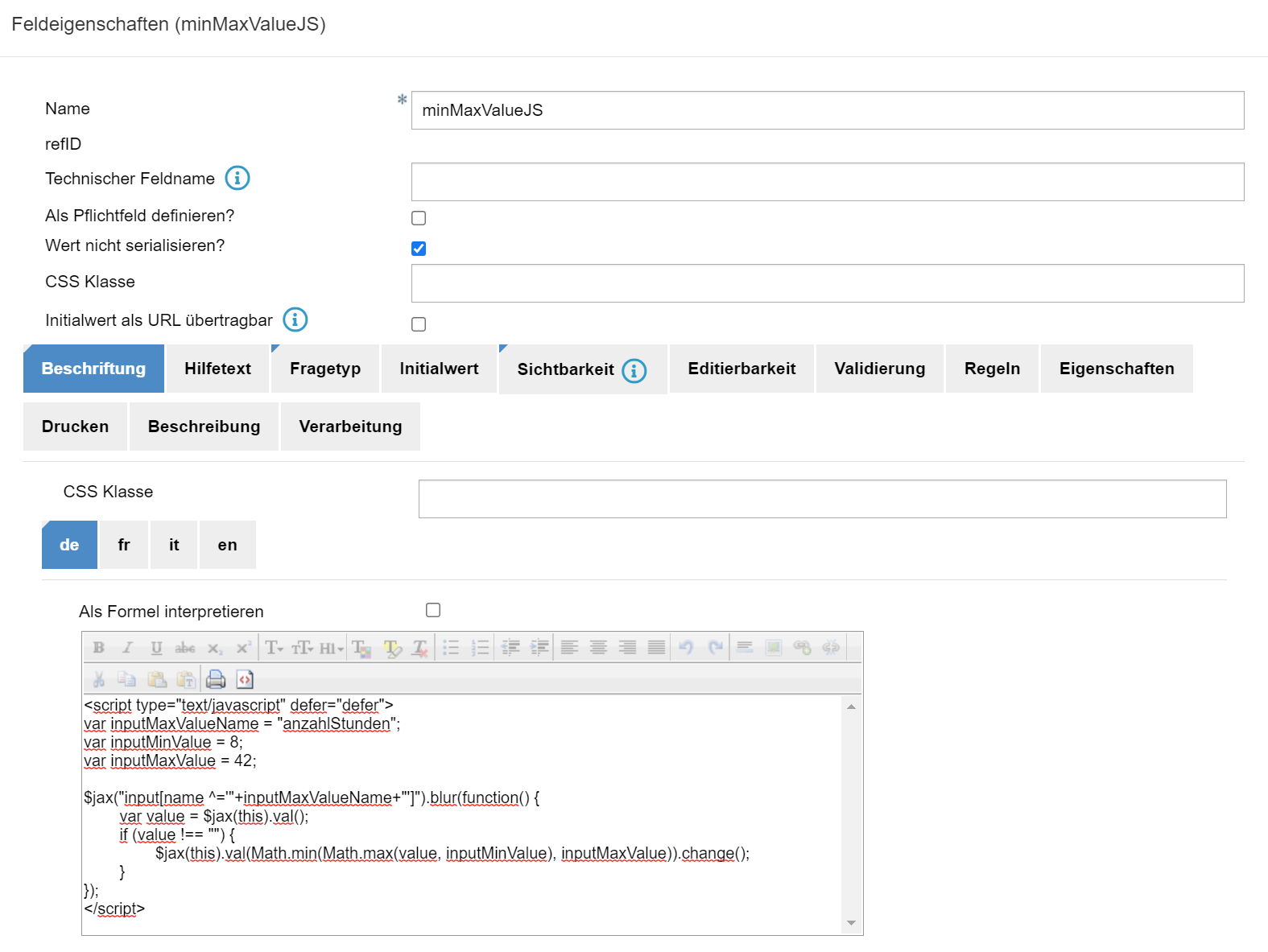 <script type="text/javascript" defer="defer"> var inputMaxValueName = "xxx"; var inputMinValue = y; var inputMaxValue = z; $jax("input[name ^='"+inputMaxValueName+"']").blur(function() { var value = $jax(this).val(); if (value !== "") { $jax(this).val(Math.min(Math.max(value, inputMinValue), inputMaxValue)).change(); } }); </script>Im JS Code die var Werte vom Formular übernehmen: