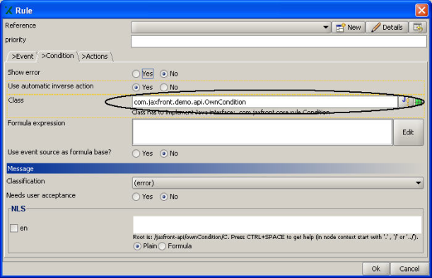 The class need to implement the com.jaxfront.core.rule.Condition interface. If you click on the button next to the text field ( ), JAXFront will try to load the class (through the specified classpath) and check if the Condition interface is implemented. A red bullet indicates that the class can not be loaded or it does not implement the Condition interface.