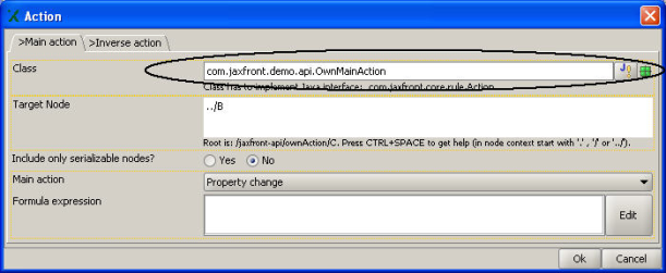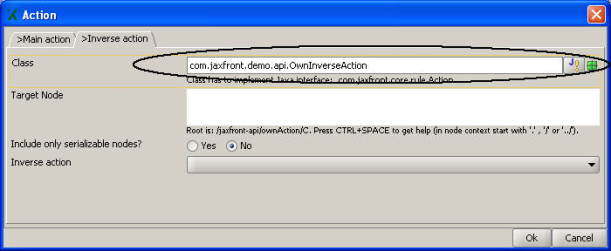 The class need to implement the Action interface: com.jaxfront.core.rule.Action