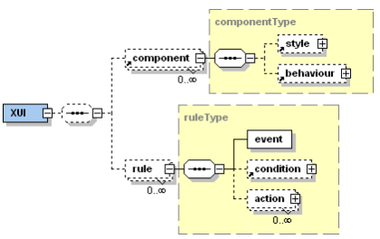 The XUI specification consists of a quantity of absolutely addressed visualization components (component), which connects an element from an XML instance with a representation type and the appropriate parameterizing possibilities for this type. In addition, global rules (rule) can be defined. These rules can be used in different contexts. These rules can be used in different contexts. See the relevant section, further in this document.