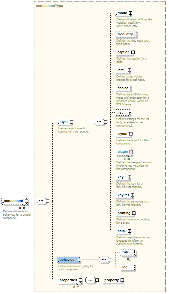 In the logical structure, there is a difference between representation- (style) and behavior-relevant (behaviour) information units for each XUI component. The settings defined under style affect the appearance of the visual component, while the behavior specifications define the rules that govern it. The definition of rules extends the W3C XML schema syntax, which is not capable of defining field spreading validating rules.