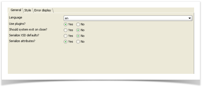 Show help panel? | No | Defines whether a Help page should be displayed in the north where the XML Schema annotation text of the selected tree netry will be displayed. |
