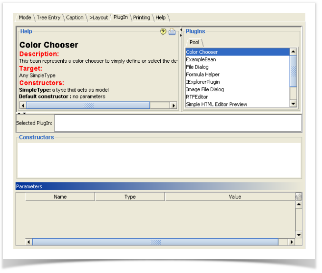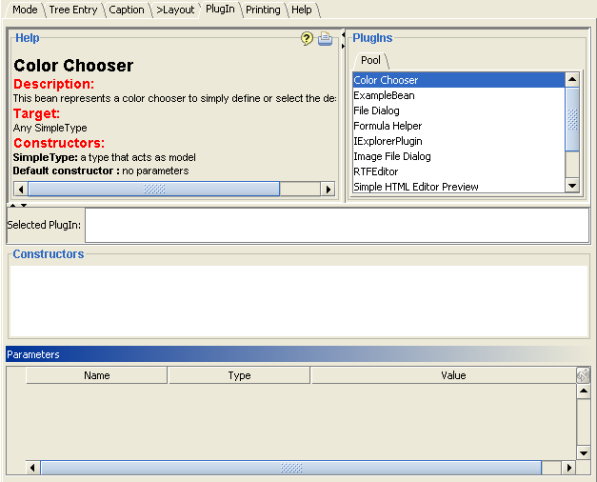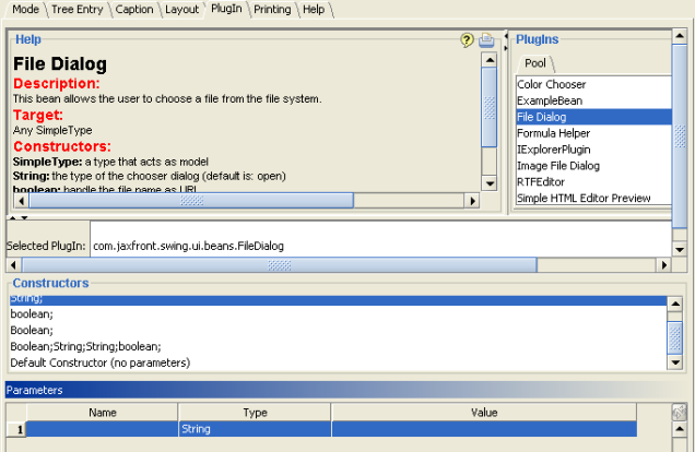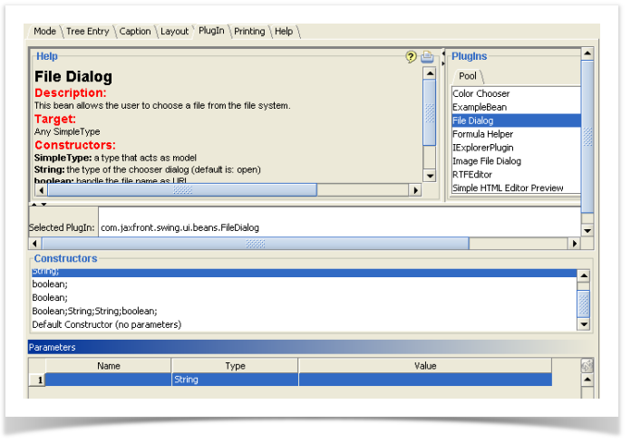 The PlugIn classes are instantiated with the Java Reflection API. A list of all constructors of this class appears, with a combination of parameter types to be processed by JAXFront. (see section 2.5.3.1). If no constructors are displayed, a Java Default Constructor exists for the selected class.