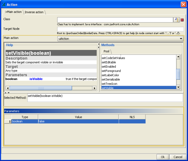 | With the indication of its own Java class, the condition can be implemented. The class must implement the Action interface. If a standard GUI action or a change of model is indicated, in combination with its own class, both actions are implemented. The own action implementation is executed last. |