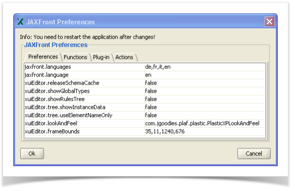 jaxfront.language | de | Defines the default language used by JAXFront and the XUI-Editor. |