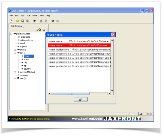 Type in any node name and click 'OK'. A new dialog pops up with all the target nodes. The selected node will be displayed in the underlying XML schema tree.