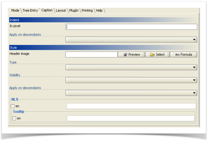 The Caption tab enables you to define a heading for the current component. By default, only group elements, both simple and complex, are drawn within the frame. In this way, you can better visualize the grouping. However, you can define a frame or another kind of heading for each individual component.